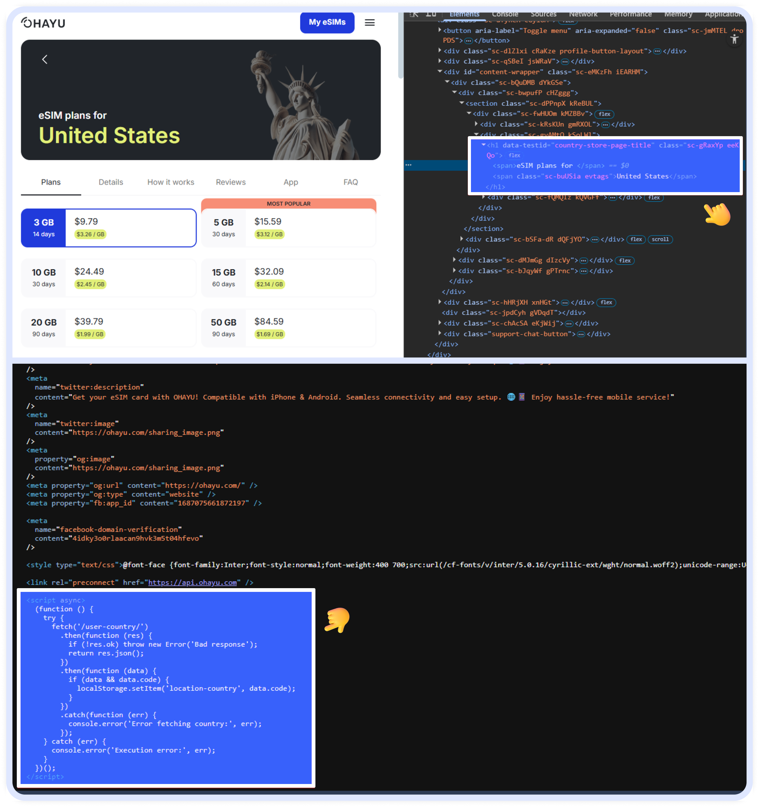 Ohayu eSIM website page displaying U.S. data plans from 3 GB ($9.79) to 50 GB ($84.59), with browser developer tools showing HTML, CSS, and JavaScript code.